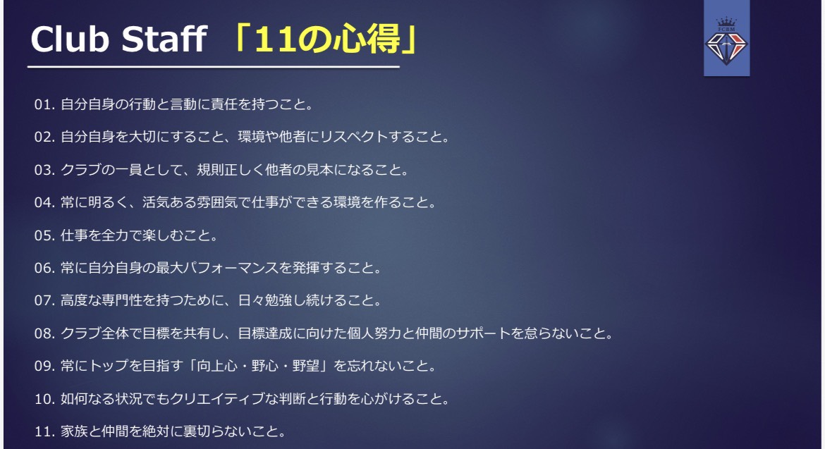 クラブの理念や「Club staff11の心得」に共感し、主体的に学び、行動できる姿勢を大切にしています。