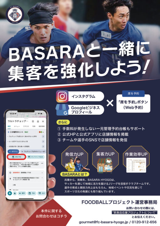 このプロジェクトは、バサラ兵庫を応援してくださる地域の飲食店様とファン・サポーターをつなぎ、“食べて応援できる街づくり”を目指す取り組みです。
